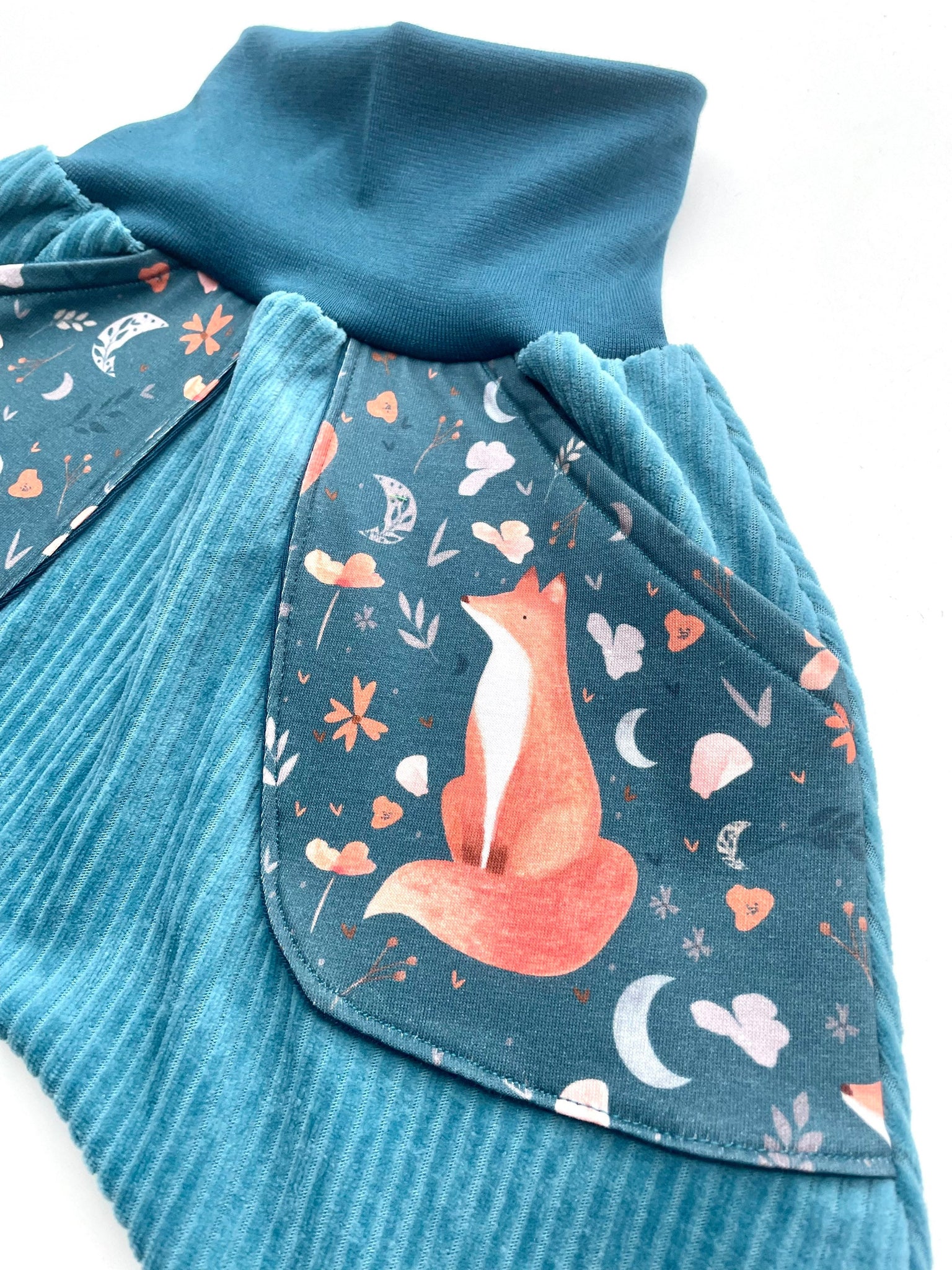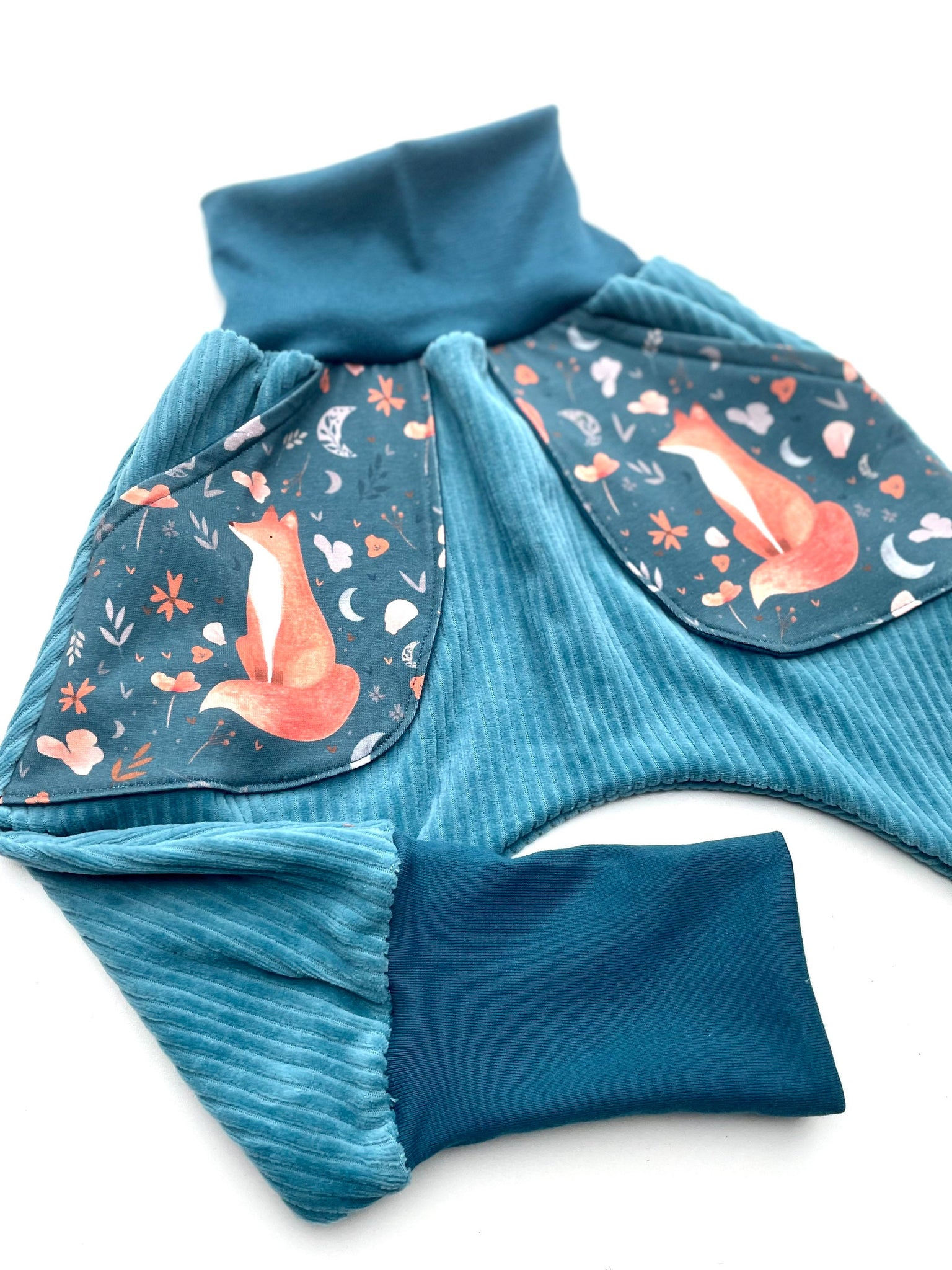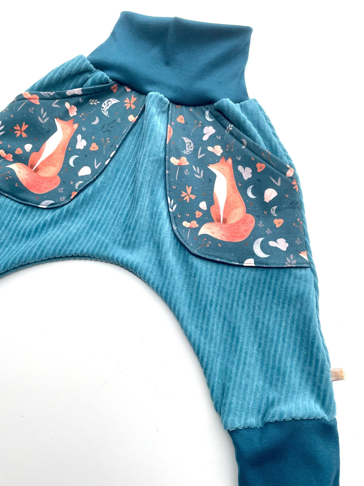 Mit liebe genähte Bio- Kuschel Breitcordnicky Hose mit Taschen im schönen Fuchs Design.